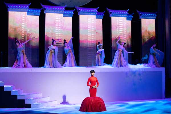 《蜀绣》舞台则是尽显国风意境,剧照中李宇春穿着形似鲤鱼的红色长裙,站立于国风投影舞台之中,四周的水墨屏风更是增添了几分韵味,身后的舞蹈演员们也是身穿古代服装,与整个舞台相得益彰,令人宛若走入一场似真似幻的“游园惊梦”之中。