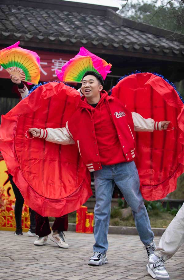 在桐木村新春广场舞大赛中,学长团二话不说拿起装备就表演起了广场舞版主题曲《宝藏就是你》。大家分工明确有人敲锣打鼓、有人转手绢舞龙,默契十足,瞬间点燃现场氛围。蒲熠星更是化身rap担当,一边舞扇一边唱快嘴英文rap,同时还踏着秧歌步伐精准踩点,酷炫又不失风趣,大家看此立马笑作一团。