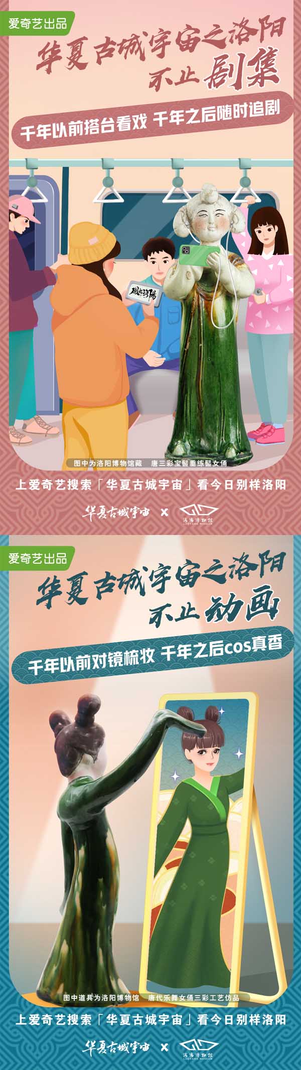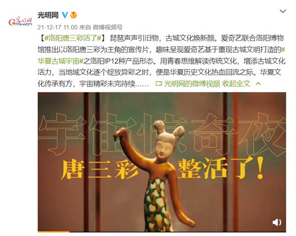 当白日嘈杂人声退去,仕女文物一跃而下,畅游在“华夏古城宇宙之洛阳”IP所开发的剧集、综艺、动画片、纪录片、电影、衍生品、舞台剧、漫画、商业地产、VR全感、游戏、文学十二种产品形态中,唐三彩仕女跨越时间空间壁垒超前尝试VR技术,体验了一把跨时代的技术潮儿。视频中上演了一出洛阳博物馆惊奇夜,精准诠释了古城和宇宙、非遗和科技结合的创新内涵。用洛阳非遗看"洛阳IP”开发,让若干年前技术与艺术相融合的文物唐三彩在数字技术的干预下能听会说,从而冲破时间、空间界限壁垒的局限,让过去文物和现在科技的相互点亮,由此可见古物虽无声,文化尚能语,只有搭建好历史文化输出平台,创新传统文化表达形式,才能够实现古城文化新解,这是"洛阳IP”一直大力宣推洛阳非遗的原因。爱奇艺华夏古城宇宙用唐三彩视角“验收”对"洛阳IP”开发的项目答卷,纵观"洛阳IP”开发进程,从剧集、动画、电影、真人电影中运用的宫灯、建筑等元素,从纪录片选择的历史题材焦点到唐三彩拟人化趣味视频,都不难看出"洛阳IP”的开发核心是深度挖掘古城文化底蕴,成为优秀传统文化再度走进年轻人圈层的介质。"洛阳IP”赋予传统文化和历史文物合理想象,从商业开发转变为以文化输出为内核,这种借非遗传承非遗、传承传统文化的理念与光明网致力弘扬非遗的想法不谋而合,也是“华夏古城宇宙”IP所创作的唐三彩视频能够得到光明网认可的重要原因。