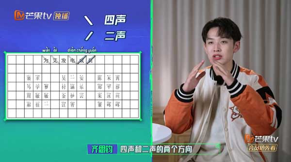 寻宝途中,齐思钧通过现场道具快速推断出故事背景,推断时他的表情和声音像极了现场主持人,之后他还将声调标法口诀运用到谜题中,通过“一声平,二声扬,三声上去”的相关知识成功解谜,举手投足间足以见其扎实的主持人功底。
