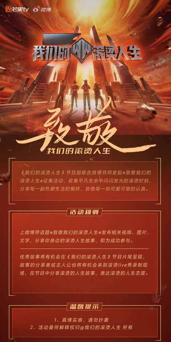 #致敬我们的滚烫人生#活动将作为节目内容的拓展和延续,全面触及生活中的各个领域,鼓励更多的人发现自己生活中的滚烫瞬间,也一起看见生活中更多人的奋斗与拼搏,坚守与奉献。