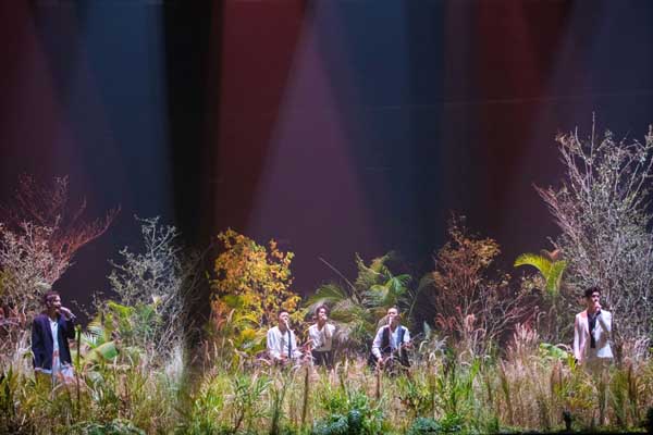 陈辉部落的《凄美地》舞台则采用实景丛林,将“绿野仙踪”搬到了观众的眼前,陈辉携黄贯中、言承旭、张云龙、刘端端五位哥哥身穿黑白穿搭,站在丛林之中温柔唱歌的画面可谓是非常养眼。