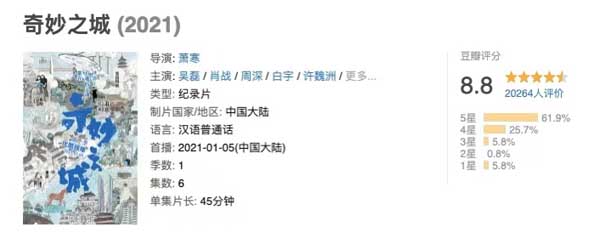 作为2021年优酷人文纪录片的头号领跑者,《奇妙之城》进一步巩固了优酷人文在纪录片行业内的实力及地位。据统计,2020年优酷的人文内容中,有21部作品的豆瓣评分达8分以上,9分以上的作品也达11部之多,同时优酷已经连续两年被国家广电总局评为“年度优秀纪录片播出机构”。今年开年的高口碑作品《奇妙之城》更进一步夯实了优酷人文的匠心内容品牌,为人文产业发展添砖加瓦。