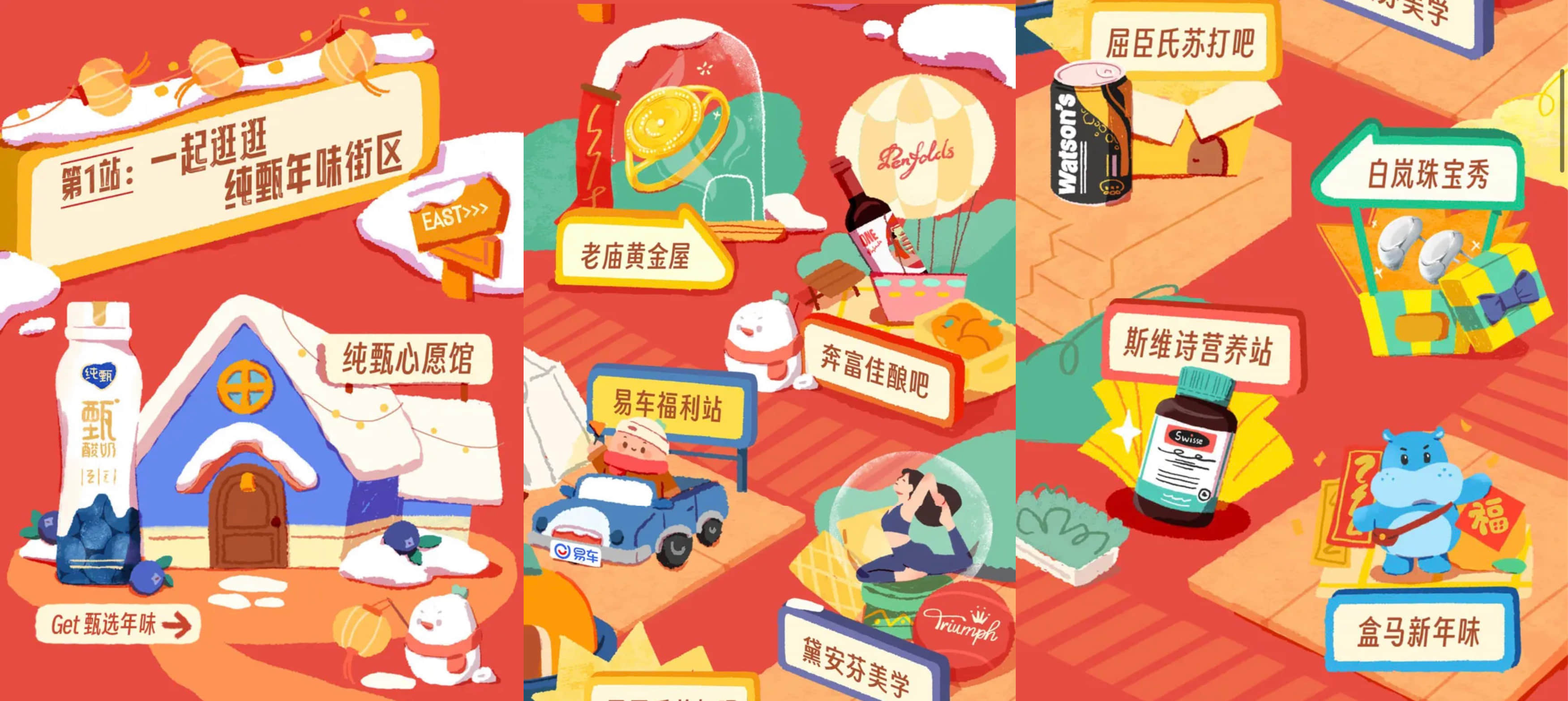 除了纯甄心愿馆,还有老庙黄金屋、奔富佳酿吧、易车福利站、黛安芬美学、屈臣氏苏打吧、白岚珠宝秀、斯维诗营养站和盒马新年味。这么多年味场馆,涵盖了我们对新年礼物的所有憧憬。在“逛春街”时,点击每个场馆,还能直接进入到对应品牌的专属阵地,收获另一片年味天地。