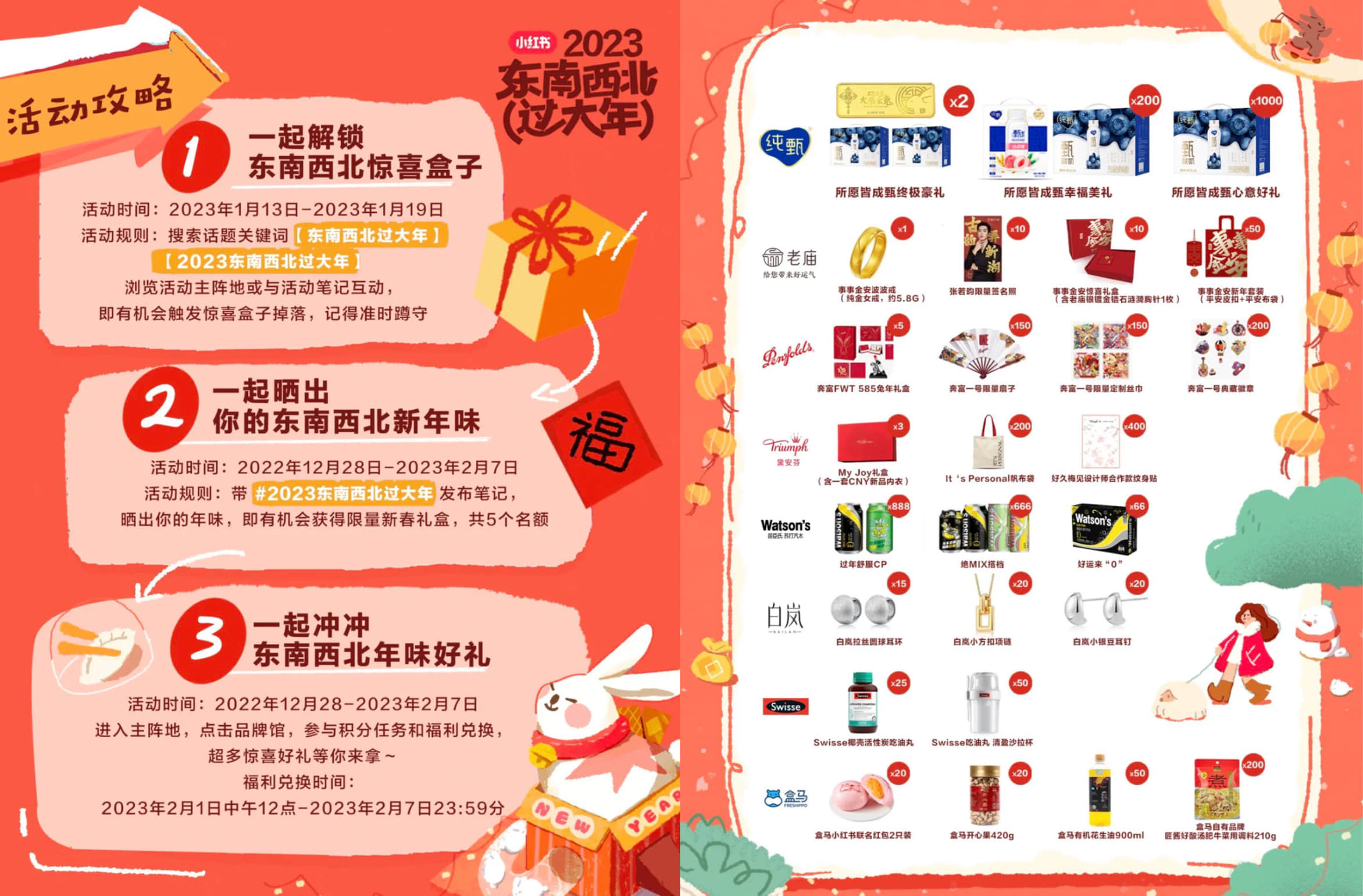 2023年的春节,注定是个特别的春节,为了让这个春节更加难忘,更加具有仪式感,小红书携手纯甄,联合上汽大众、老庙、Penfolds奔富、易车、Triumph黛安芬、屈臣氏苏打汽水、白岚、Swisse斯维诗和盒马,打造了一场热闹的新年盛宴——「2023东南西北过大年」。