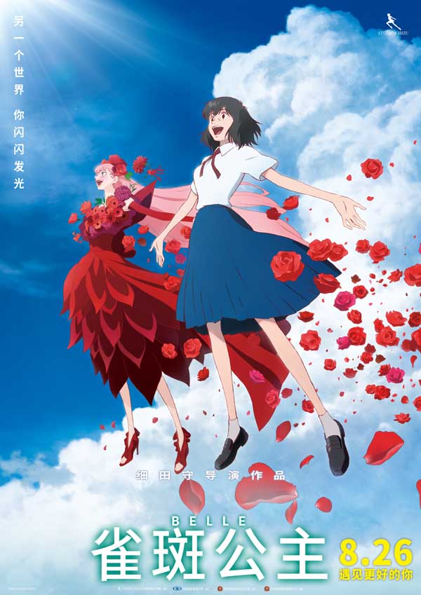 伴随终极预告一同释出的还有《雀斑公主》终极海报,昭示着小铃和贝儿双重身份。画面中贝儿和小铃共同站在细田守导演标志性的“积雨云”之上,对着远方张开双臂。阳光在前方,红色的玫瑰铺开一条华丽道路。贝儿与小铃表情明媚充满希望,目光坚定,有着锐不可当、势如破竹的力量,似乎可以冲破所有阻碍,改写命运。这也不禁让人好奇,元宇宙U之旅如何让胆怯自闭的小铃与真实的自己和解,找到自己曾经丢失的一面,完成这场成长之旅?
