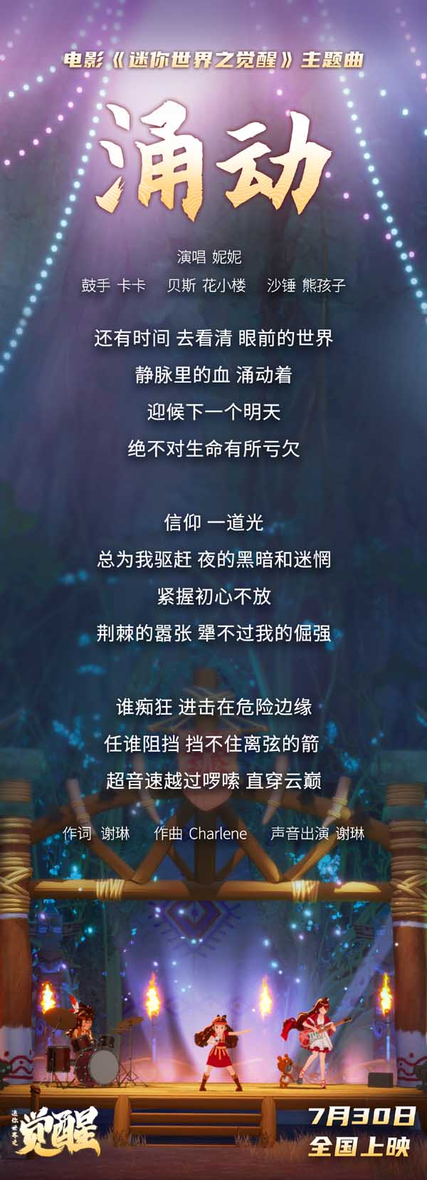 主题曲MV全场景均由动画角色展现,乐队成员给观众的“小惊喜”,“女主角”妮妮激情献唱,与“鼓手”卡卡、“沙锤演奏者”熊孩子和虚拟偶像贝斯手花小楼,共同组成乐队“觉醒天团”,还有黑龙“友情出演”,让观众直呼意想不到,却大大拉进角色与观众之间的距离。此举可谓主创团队的“用心炫技”之作,更直观、更沉浸地提升观众对于影片世界观的信念感,更细节、更诚意地展示制作团队的匠心设计。